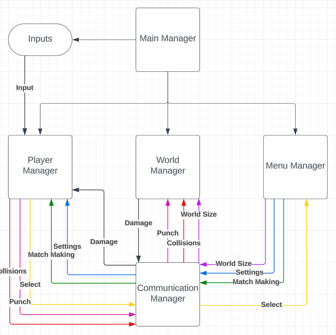 I decided to architect this project in a very specific way, where scaling and modularity are at the very core of the project. I did this by using manager classes, data classes, method classes, and finally something I call a communication class. The communication class is responsible for connecting the different manager classes and enables the unilateral ability to disable any system of the game without affecting the others. The following diagram explains the communication class in a simple way:
